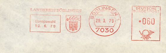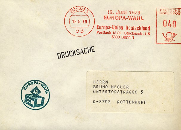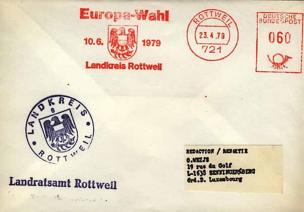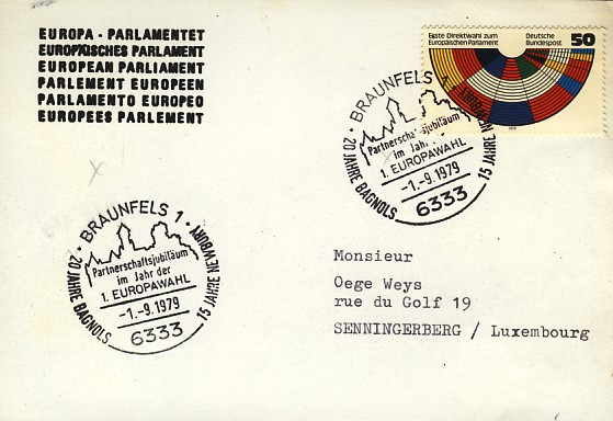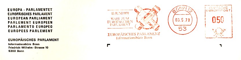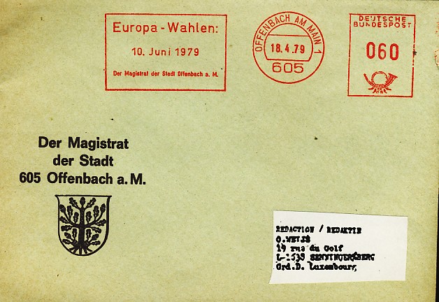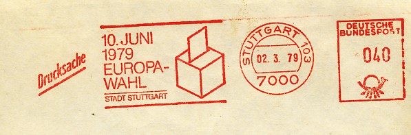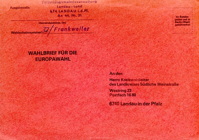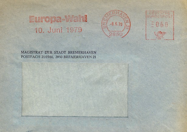 émis pour ces élections![]() et le FDC ![]() 15 EMA ont été émises : Balingen, Boblingen (2), Bonn 1, Bonn 12 (2), Bremenhaven, Heidenheim, Kiel, Limburg, Offenbach, Pforzheim (2), Rottweil, Stuttgart, ![]() ![]() ![]() ![]() ![]() ![]() ![]() ![]() ![]() ![]() ![]() ![]() ![]() ![]() ![]() ![]() et une EMA avec la promo des élections sur l'enveloppe (Esslingen) ![]() 4 TAD émis : Berus, Braunfels, Hamburg, Nurnberg ![]() ![]() ![]() ![]() Wahlbrief : lettre de vote pour les élections européennes ![]() |