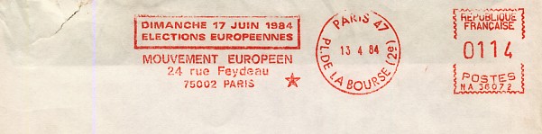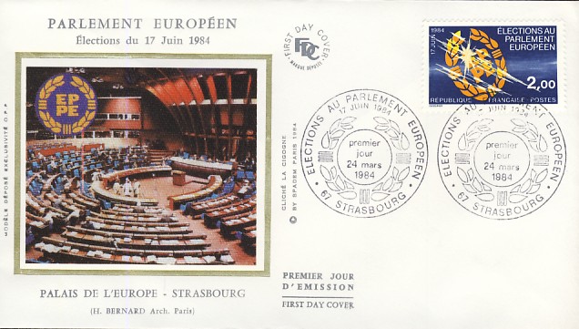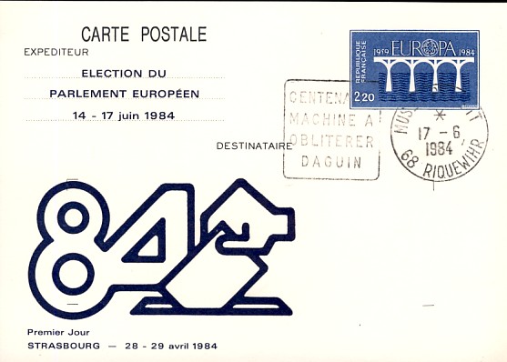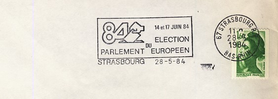 émis pour ces élections![]() et son FDC ![]() 1 entier repiqué pour ces élection par le Musée de la Poste de Riquewihr ![]() 2 flammes de Strasbourg (Haut Rhin et Conseil de l'Europe) ![]() ![]() et une EMA du Mouvement Européen ![]() |