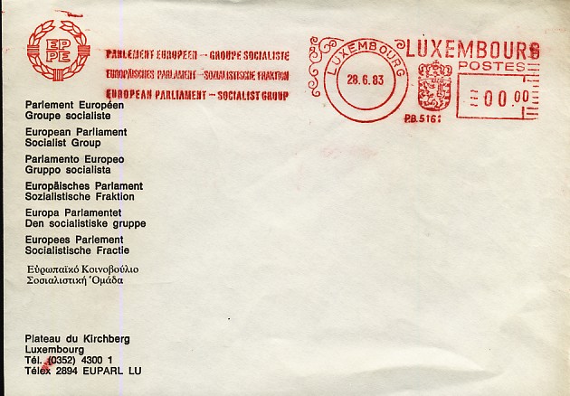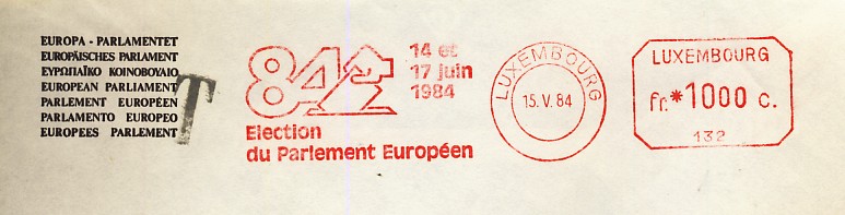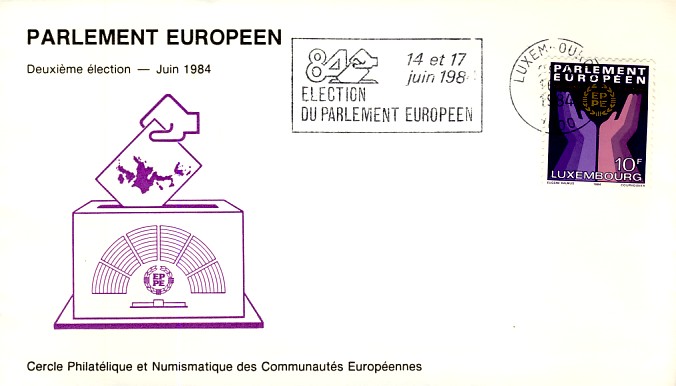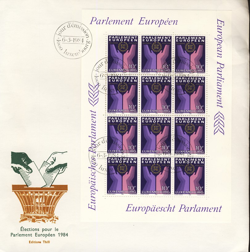 émis pour ces élections et le feuillet de 10 timbres![]() ![]() les FDC ![]() ![]() Une flamme de Luxembourg ![]() et 3 EMA (pour les 2 premières le numéro de la machine est différent) ![]() ![]() ![]() enveloppe de propagande électorale avec un double affranchissement : Belgique-Luxembourg ![]() |