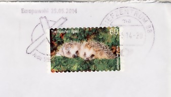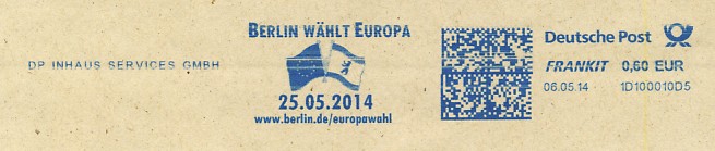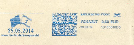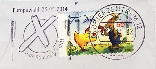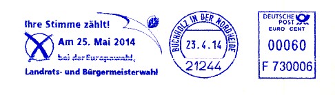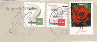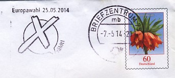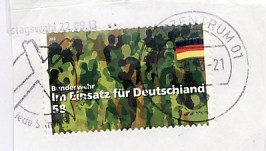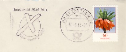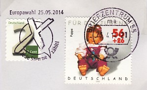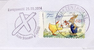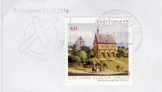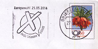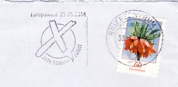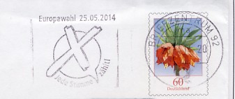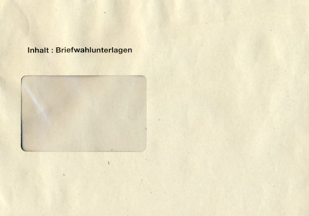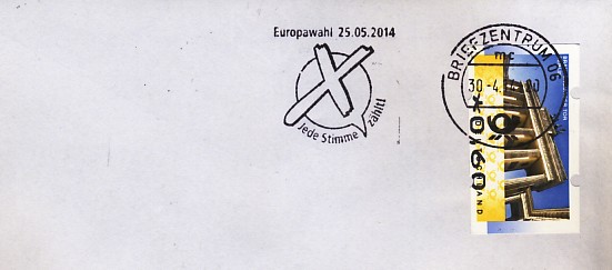 Une flamme a été émise dans diverses régions d'Allemagne : connue avec les centres 01, 04, 06, 12, 25, 26, 45, 55, 56, 65, 67, 72, 79, 88 et 92 ![]() ![]() Une oblitération temporaire de Laatzen ![]() des empreintes ![]() ![]() et une enveloppe électorale ![]() |