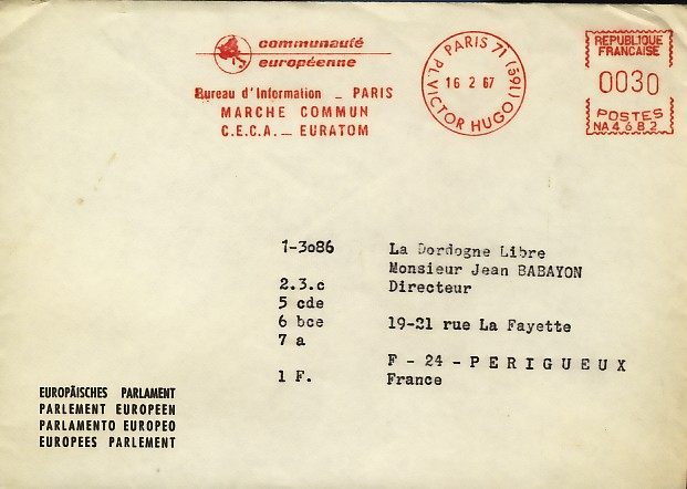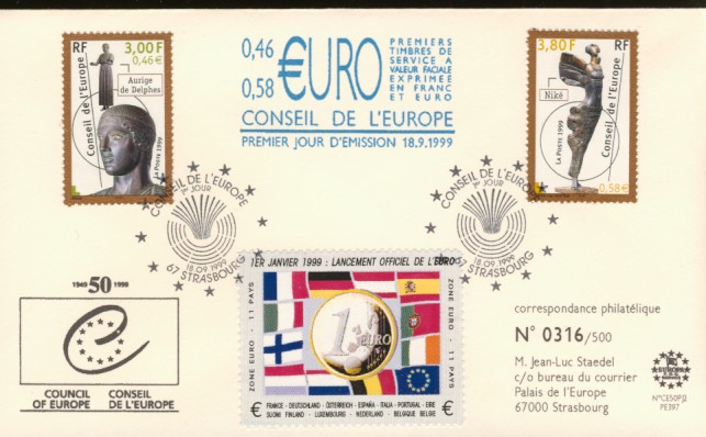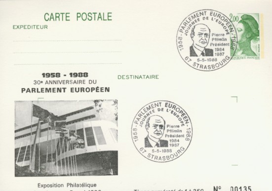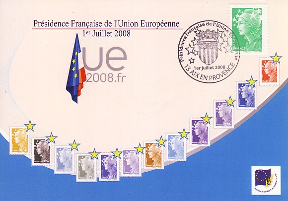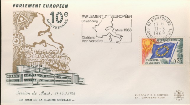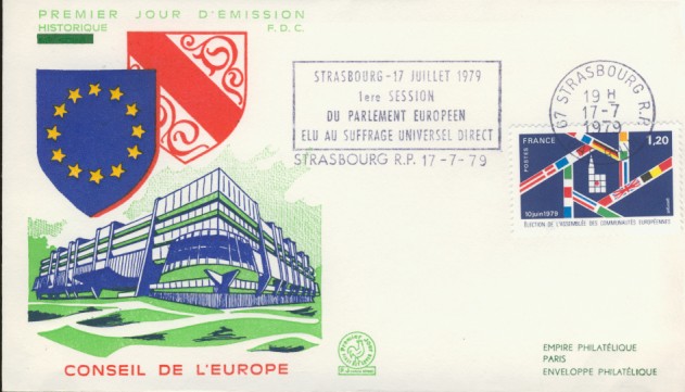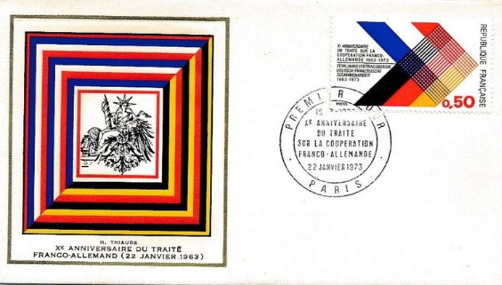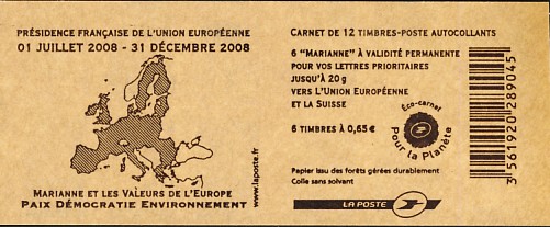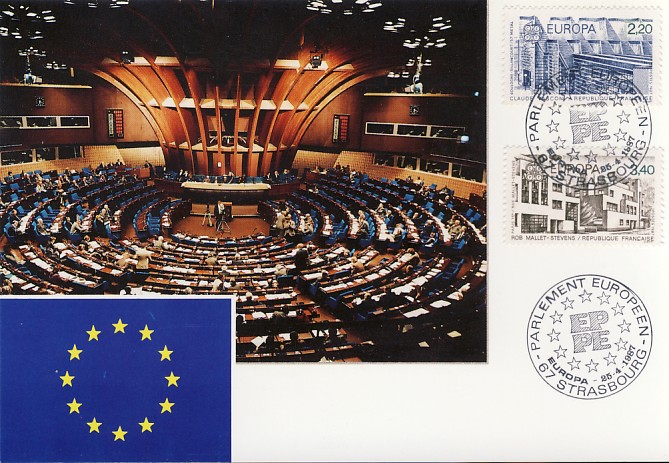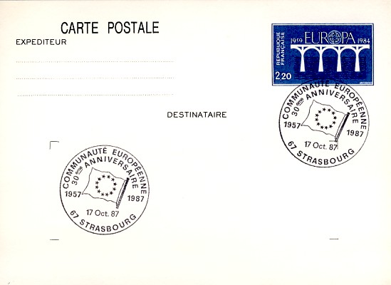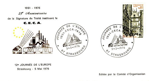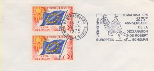 fondateur de la Communauté Economique Européenne Déclaration Schuman du 9 mai 1950 : « la production franco-allemande de charbon et d'acier dans sa totalité soit placée sous une Haute Autorité, dans la structure d'une organisation qui s'ouvre à la participation des autres pays de l'Europe. » Création de la Communauté européenne du charbon et de l'acier (CECA) par le traité de Paris le 18 avril 1951 entre l'Allemagne de l'Ouest, la Belgique, la France, l'Italie, le Luxembourg et les Pays Bas qui entre en vigueur le 23 juillet 1952, le marché commun du charbon le 10 février 1953 et celui de l'acier le 1er mai 1953. Création de la Communauté européenne de l'énergie atomique (CEEA ou Euratom) par un traité signé à Rome le 25 mars 1957 entre l'Allemagne de l'Ouest, la Belgique, la France, l'Italie, le Luxembourg et les Pays Bas et entré en vigueur le 1er janvier 1958. Création de la Communauté Economique Européenne (CEE) par le Traité de Rome du 25 mars 1957 entre l'Allemagne de l'Ouest, la Belgique, la France, l'Italie, le Luxembourg et les Pays Bas et entré en vigueur le 1er janvier 1958. L'Assemblée Parlementaire qui deviendra le Parlement Européen est crée par le traité de Rome. En 1962 retrait de l'Algérie suite à son indépendance et son refus de rester dans la CEE Fusion de la CEE, de la CECA et de l'Euratom par le Traité de Bruxelles le 8 avril 1965 et entré en vigueur le 1er juillet 1967. La CEE est remplacée par Union Européenne le 1er novembre 1993. Adoption de l'Euro : 1er janvier 1999 1956 : Europa, construction européenne ![]() ![]() 1958 : R. Schuman, 1er Président du Parlement européen ![]() 1958 : CECA, 8ème anniversaire ![]() 1962 : CEE ![]() 1962 : 5ème anniversaire du Traité de Rome (CAD non illustré) ![]() 1964 : session du parlement européen ![]() 1966 : Parlement européen ![]() ![]() 1967 : session du Parlement européen ![]() 1967 : CEE ![]() 1968 : session du Parlement Européen ![]() 1968 : 10ème anniversaire du Parlement Européen ![]() 1969 : Parlement européen ![]() 1970-71 : Parlement européen : session ![]() ![]() 1972 : 20 ans de la CECA ![]() 1973 : 10ème anniversaire du Traité de l'Elysée ![]() ![]() 1973 : Parlement européen ![]() ![]() 1975 : 25ème anniversaire de la déclaration Schuman ![]() 1976 : 25ème anniversaire de la CECA ![]() 1977 : 20ème anniversaire du Traité de Rome ![]() ![]() 1977 : Palais de l'Europe, siège du Parlement Européen ![]() ![]() 1978 : 20ème anniversaire du Parlement Européen ![]() ![]() 1978 : Parlement Européen ![]() 1979 Elections européennes (voir ce chapitre) 1979 : batiments européens ![]() ![]() ![]() 1979 : Parlement européen : session ![]() ![]() 1981 : Parlement européen : session ![]() ![]() 1982 : 25ème anniversaire du traité de Rome ![]() ![]() ![]() et 3 entiers "Carte Postale" reprenant l'historique des adhésions ![]() ![]() ![]() 1983 : 25ème anniversaire du Parlement Européen ![]() ![]() 1984 : élections européennes (voir ce chapitre) 1984 : Conseil Européen à Fontainebleau (juin) ![]() 1985 : Parlement européeen : session ![]() ![]() 1986 : Parlement européen : session ![]() ![]() ![]() ![]() 1987 : 30ème anniversaire du traité de Rome ![]() ![]() 1987 : Parlement européen ![]() 1988 : 30ème anniversaire du Parlement Européen ![]() ![]() ![]() 1989 : Conseil Européen à Strasbourg (décembre) ![]() 1989 : Elections européennes (voir ce chapitre) 1991 :Parlement européen : session ![]() ![]() 1992 : 35ème anniversaire du traité de Rome (CAD non illustré) ![]() 1993 : 1er janvier mise en place du marché unique (émission du dernier trimestre 1992) ![]() ![]() ![]() ![]() 1994 : élections européennes (voir ce chapitre) 1997 : 40ème anniversaire du traité de Rome (EMA... encore en vigueur en 1998 ![]() 1998 : 40ème anniversaire du Parlement Européen ![]() 1998 : inauguration du nouveau batiment du Parlement Européen ![]() ![]() ![]() 1998 : l'euro arrive ![]() 1999 : arrivée de l'euro ![]() ![]() ![]() ![]() 1999 : élections européennes (voir ce chapitre) 2000 : Conseil Européen à Biarritz (octobre) et Nice (décembre) ![]() 2000 50ème anniversaire de la déclaration Schuman ![]() 2000 : Parlement européen : session ![]() ![]() 2001 : demain l'€ ![]() ![]() 2002 : mise en service des pièces et billets en euro ![]() ![]() ![]() 2003 : 40ème du traité de l'Elysée ![]() ![]() 2003 : Charde des droits fondamentaux européen ![]() ![]() 2003 : Parlement européen : session ![]() 2003 : commission ![]() 2004, adhésion des 10 pays : Chypre, Estonie, Hongrie, Lettonie, Lituanie, Malte, Pologne, République Tchèque, Slovaquie, Slovénie ![]() ![]() ![]() 2007 : 50ème anniversaire du Traité de Rome ![]() ![]() ![]() 2008 : grands projets européens : l'Euro ![]() 2008 : grands projets européens : Présidence Européenne ![]() ![]() ![]() 2009 : Elections européennes (voir ce chapitre) 2009 : Parlement européen ![]() 2010 : 60ème anniversaire de la déclaration Schuman ![]() 2013 : 50ème anniversaire du traité de l'Elysée ![]() ![]() 2014 : Elections européennes (voir ce chapitre) 2014 : 64ème anniversaire de la déclaration Schuman (Timbres personnalisés ![]() 2017 : Parlement européen ![]() 2019 : élections européennes (voir ce chapitre) 2022 : Présidence Européenne ![]() |