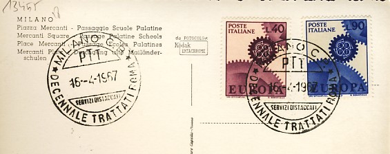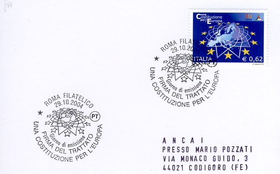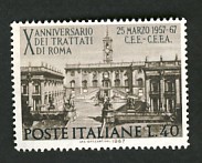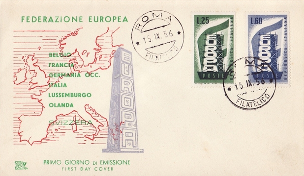 fondateur de la Communauté Economique Européenne Déclaration Schuman du 9 mai 1950 : « la production franco-allemande de charbon et d'acier dans sa totalité soit placée sous une Haute Autorité, dans la structure d'une organisation qui s'ouvre à la participation des autres pays de l'Europe. » Création de la Communauté européenne du charbon et de l'acier (CECA) par le traité de Paris le 18 avril 1951 entre l'Allemagne de l'Ouest, la Belgique, la France, l'Italie, le Luxembourg et les Pays Bas qui entre en vigueur le 23 juillet 1952, le marché commun du charbon le 10 février 1953 et celui de l'acier le 1er mai 1953. Création de la Communauté européenne de l'énergie atomique (CEEA ou Euratom) par un traité signé à Rome le 25 mars 1957 entre l'Allemagne de l'Ouest, la Belgique, la France, l'Italie, le Luxembourg et les Pays Bas et entré en vigueur le 1er janvier 1958. Création de la Communauté Economique Européenne (CEE) par le Traité de Rome du 25 mars 1957 entre l'Allemagne de l'Ouest, la Belgique, la France, l'Italie, le Luxembourg et les Pays Bas et entré en vigueur le 1er janvier 1958. L'Assemblée Parlementaire qui deviendra le Parlement Européen est crée par le traité de Rome. Fusion de la CEE, de la CECA et de l'Euratom par le Traité de Bruxelles le 8 avril 1965 et entré en vigueur le 1er juillet 1967. La CEE est remplacée par Union Européenne le 1er novembre 1993. Adoption de l'Euro : 1er janvier 1999 1956 : Europa, construction européenne ![]() ![]() 1957 : signature des Traités de Rome ![]() 1957 : CECA ![]() 1958 : CECA - 8ème anniversaire ![]() ![]() ![]() 1962 : CEE, CECA CEEA ![]() 1965 Euratom ![]() 1967 : 10ème anniversaire du traité de Rome ![]() TAD Milano ![]() FDC non illustré ![]() Flammes ![]() ![]() 1971 : 20ème anniversaire de la CECA ![]() ![]() 1975 : Conseil Européen à Rome (décembre) ![]() 1975 : Euratom ![]() 1977 : Euratom ![]() 1978 : Commission ![]() 1979 : Elections européennes (voir ce chapitre) 1980 : Conseil européen à Venise (juin) ![]() 1982 : 25ème anniversaire du traité de Rome ![]() ![]() 1983 : Euratom ![]() 1983 : commission ![]() 1984 : Elections européennes (voir ce chapitre) 1985 Conseil Européen à Milan (juin) ![]() 1987 : 30ème anniversaire du traité de Rome ![]() 1989 : Elections européennes (voir ce chapitre) 1990 : Présidence du Conseil des Ministres de la Communauté Européenne ![]() 1990 : Conseil Européen à Rome (octobre et décembre) ![]() 1992 : 1er janvier 1993 mise en place du marché unique (émission du dernier trimestre 1992) ![]() ![]() 1993 : marché unique ![]() ![]() 1994 : Elections européennes (voir ce chapitre) 1995 : 40ème anniversaire de la conférence de Messine ![]() 1996 : Conférence intergouvernementale à Turin (mars) ![]() 1996 : Conseil Européen à Florence (juin) ![]() 1996 : 40e anniversaire du rapport Spaak ![]() 1997 : 40ème anniversaire du traité de Rome ![]() ![]() 1998 : arrivée de l'euro au 1/1/99 ![]() émis en carnet ![]() ![]() 1999 : Elections européennes (voir ce chapitre) 2001 : Charte des droits fondamentaux ![]() ![]() 2002 : mise en service des pièces et billets en euro ![]() ![]() 2003 : Présidence de l'Union Européenne ![]() ![]() 2004, adhésion des 10 pays : Chypre, Estonie, Hongrie, Lettonie, Lituanie, Malte, Pologne, République Tchèque, Slovaquie, Slovénie ![]() ![]() ![]() ![]() 2004 : adoption de la Constitution Européenne, finalement non adoptée ![]() ![]() 2007 : 50ème anniversaire du traité de Rome ![]() ![]() ![]() ![]() ![]() ![]() 2009 : Elections européennes (voir le chapître) 2009 : 10 ans de l'Euro ![]() 2014 : Présidence de l'Union Européenne ![]() 2017 : 60ème anniversaire du traité de Rome ![]() ![]() 2023 : 30ème anniversaire du traité de Maastricht ![]() |