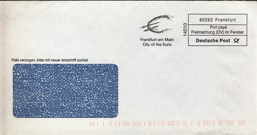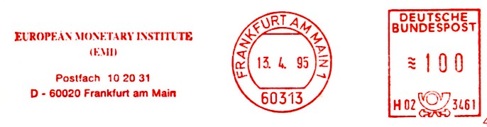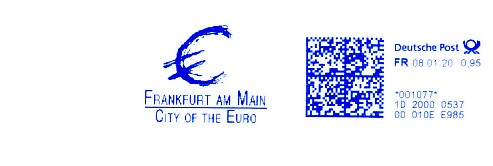 ![]() 1998 : Allemagne : BCE à Francfort 2008 : Luxembourg 2008 : Pays Bas : sur le Main (la feuille de 10 timbres 10ème anniversaire de la BCE 10ème anniversaire de la BCE comporte des mentions marginales) ![]() 2008 : Roumanie : 10ème anniversaire de la BCE ![]() 2008 Pays Bas : 10ème anniversaire de la BCE Entiers Postaux ![]() 2008 : Estonie, 10ème anniversaire de la BCE (représenrtation de l'immeuble de la BCE à Francfort) oblitéré 1er jour du 2 juin 2008 Oblitération temporaires ![]() 26 mai 2008 : Bucarest 10ème anniversaire de la BCE Empreintes de machine à affranchir ![]() 1995 : empreinte de la machine N°H 02 3461 du précurseur de la BCE à Francfort sur le Main ![]() 1998 : empreinte de la machine N°H 02 3461 de la BCE à Francfort sur le Main ![]() 2004 : empreinte de la machine N°H 501433 de la BCE à Francfort sur le Main ![]() 2016 : empreinte de la machine N°1D1300136A de la BCE à Francfort sur le Main Oblitération 1er jour non illustrée ![]() 2008 : Luxembourg - 1er jour pour le 10ème anniversaire de la BCE Francfort sur le Main : Cité de l'Euro ![]() 2004 : empreinte de la machine N°F 542322 de Francfort sur le Main, Cité de l'Euro ![]() 2006 : empreinte de la machine N°F 719697 de Francfort sur le Main, Cité de l'Euro ![]() 2011 : empreinte de la machine N°3D0600043E de Francfort sur le Main, Cité de l'Euro ![]() 2016 : empreinte de la machine N°3D06000D93 de Francfort sur le Main, Cité de l'Euro ![]() 2019 : empreinte de la machine N°1D 2000 0539 de Francfort sur le Main, Cité de l'Euro ![]() 2020 : empreinte de la machine N° 1D 2000 0537 de Francfort sur le Main, Cité de l'Euro ![]() 201? : enveloppe Port Payé de Francfort sur le Main, Cité de l'Euro |