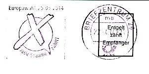 Une flamme a été émise dans diverses régions d'Allemagne : connue avec les centres 01, 04, 06, 12, 25, 26, 45, 55, 56, 65, 67, 72, 79, 88 et 92 ![]() ![]() Une oblitération temporaire de Laatzen ![]() des empreintes ![]() ![]() et une enveloppe électorale ![]() |