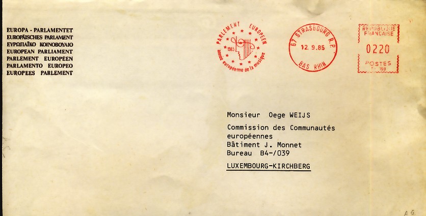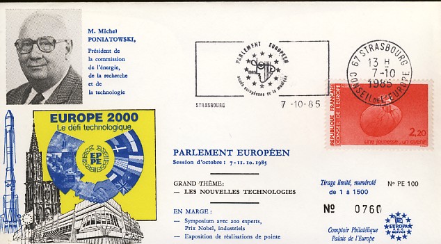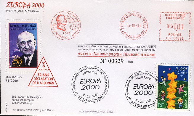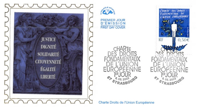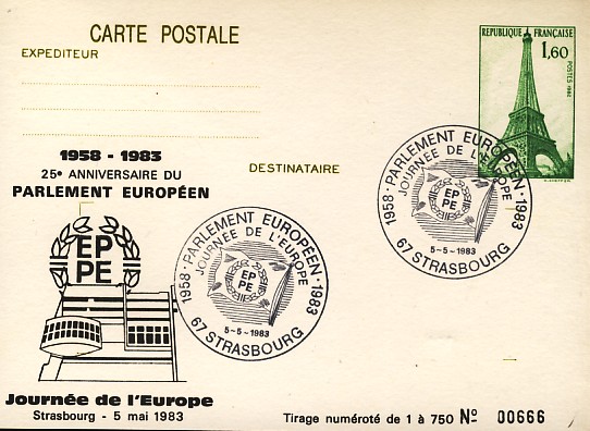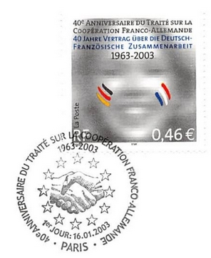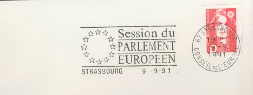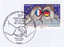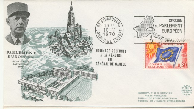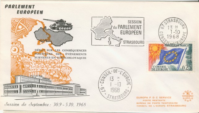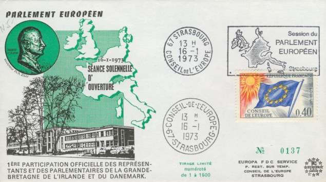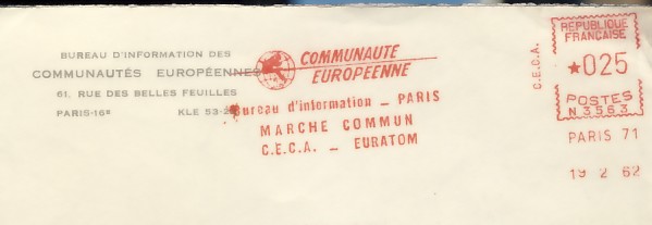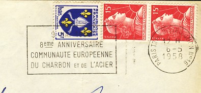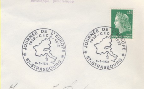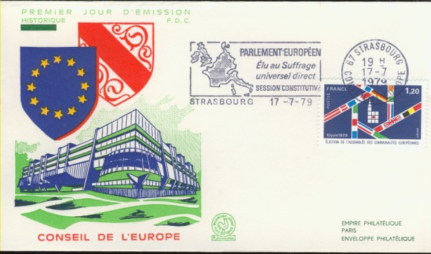 fondateur de la Communauté Economique Européenne Déclaration Schuman du 9 mai 1950 : « la production franco-allemande de charbon et d'acier dans sa totalité soit placée sous une Haute Autorité, dans la structure d'une organisation qui s'ouvre à la participation des autres pays de l'Europe. » Création de la Communauté européenne du charbon et de l'acier (CECA) par le traité de Paris le 18 avril 1951 entre l'Allemagne de l'Ouest, la Belgique, la France, l'Italie, le Luxembourg et les Pays Bas qui entre en vigueur le 23 juillet 1952, le marché commun du charbon le 10 février 1953 et celui de l'acier le 1er mai 1953. Création de la Communauté européenne de l'énergie atomique (CEEA ou Euratom) par un traité signé à Rome le 25 mars 1957 entre l'Allemagne de l'Ouest, la Belgique, la France, l'Italie, le Luxembourg et les Pays Bas et entré en vigueur le 1er janvier 1958. Création de la Communauté Economique Européenne (CEE) par le Traité de Rome du 25 mars 1957 entre l'Allemagne de l'Ouest, la Belgique, la France, l'Italie, le Luxembourg et les Pays Bas et entré en vigueur le 1er janvier 1958. L'Assemblée Parlementaire qui deviendra le Parlement Européen est crée par le traité de Rome. En 1962 retrait de l'Algérie suite à son indépendance et son refus de rester dans la CEE Fusion de la CEE, de la CECA et de l'Euratom par le Traité de Bruxelles le 8 avril 1965 et entré en vigueur le 1er juillet 1967. La CEE est remplacée par Union Européenne le 1er novembre 1993. Adoption de l'Euro : 1er janvier 1999 1956 : Europa, construction européenne ![]() ![]() 1958 : R. Schuman, 1er Président du Parlement européen ![]() 1958 : CECA, 8ème anniversaire ![]() 1962 : CEE ![]() 1962 : 5ème anniversaire du Traité de Rome (CAD non illustré) ![]() 1964 : session du parlement européen ![]() 1966 : Parlement européen ![]() ![]() 1967 : session du Parlement européen ![]() 1967 : CEE ![]() 1968 : session du Parlement Européen ![]() 1968 : 10ème anniversaire du Parlement Européen ![]() 1969 : Parlement européen ![]() 1970-71 : Parlement européen : session ![]() ![]() 1972 : 20 ans de la CECA ![]() 1973 : 10ème anniversaire du Traité de l'Elysée ![]() ![]() 1973 : Parlement européen ![]() ![]() 1975 : 25ème anniversaire de la déclaration Schuman ![]() 1976 : 25ème anniversaire de la CECA ![]() 1977 : 20ème anniversaire du Traité de Rome ![]() ![]() 1977 : Palais de l'Europe, siège du Parlement Européen ![]() ![]() 1978 : 20ème anniversaire du Parlement Européen ![]() ![]() 1978 : Parlement Européen ![]() 1979 Elections européennes (voir ce chapitre) 1979 : batiments européens ![]() ![]() ![]() 1979 : Parlement européen : session ![]() ![]() 1981 : Parlement européen : session ![]() ![]() 1982 : 25ème anniversaire du traité de Rome ![]() ![]() ![]() et 3 entiers "Carte Postale" reprenant l'historique des adhésions ![]() ![]() ![]() 1983 : 25ème anniversaire du Parlement Européen ![]() ![]() 1984 : élections européennes (voir ce chapitre) 1984 : Conseil Européen à Fontainebleau (juin) ![]() 1985 : Parlement européeen : session ![]() ![]() 1986 : Parlement européen : session ![]() ![]() ![]() ![]() 1987 : 30ème anniversaire du traité de Rome ![]() ![]() 1987 : Parlement européen ![]() 1988 : 30ème anniversaire du Parlement Européen ![]() ![]() ![]() 1989 : Conseil Européen à Strasbourg (décembre) ![]() 1989 : Elections européennes (voir ce chapitre) 1991 :Parlement européen : session ![]() ![]() 1992 : 35ème anniversaire du traité de Rome (CAD non illustré) ![]() 1993 : 1er janvier mise en place du marché unique (émission du dernier trimestre 1992) ![]() ![]() ![]() ![]() 1994 : élections européennes (voir ce chapitre) 1997 : 40ème anniversaire du traité de Rome (EMA... encore en vigueur en 1998 ![]() 1998 : 40ème anniversaire du Parlement Européen ![]() 1998 : inauguration du nouveau batiment du Parlement Européen ![]() ![]() ![]() 1998 : l'euro arrive ![]() 1999 : arrivée de l'euro ![]() ![]() ![]() ![]() 1999 : élections européennes (voir ce chapitre) 2000 : Conseil Européen à Biarritz (octobre) et Nice (décembre) ![]() 2000 50ème anniversaire de la déclaration Schuman ![]() 2000 : Parlement européen : session ![]() ![]() 2001 : demain l'€ ![]() ![]() 2002 : mise en service des pièces et billets en euro ![]() ![]() ![]() 2003 : 40ème du traité de l'Elysée ![]() ![]() 2003 : Charde des droits fondamentaux européen ![]() ![]() 2003 : Parlement européen : session ![]() 2003 : commission ![]() 2004, adhésion des 10 pays : Chypre, Estonie, Hongrie, Lettonie, Lituanie, Malte, Pologne, République Tchèque, Slovaquie, Slovénie ![]() ![]() ![]() 2007 : 50ème anniversaire du Traité de Rome ![]() ![]() ![]() 2008 : grands projets européens : l'Euro ![]() 2008 : grands projets européens : Présidence Européenne ![]() ![]() ![]() 2009 : Elections européennes (voir ce chapitre) 2009 : Parlement européen ![]() 2010 : 60ème anniversaire de la déclaration Schuman ![]() 2013 : 50ème anniversaire du traité de l'Elysée ![]() ![]() 2014 : Elections européennes (voir ce chapitre) 2014 : 64ème anniversaire de la déclaration Schuman (Timbres personnalisés ![]() 2017 : Parlement européen ![]() 2019 : élections européennes (voir ce chapitre) 2022 : Présidence Européenne ![]() |