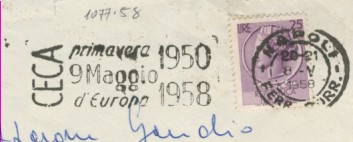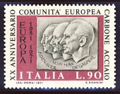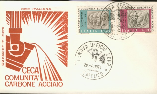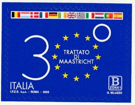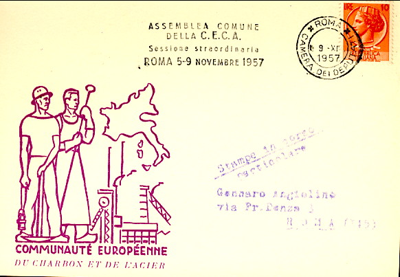 fondateur de la Communauté Economique Européenne Déclaration Schuman du 9 mai 1950 : « la production franco-allemande de charbon et d'acier dans sa totalité soit placée sous une Haute Autorité, dans la structure d'une organisation qui s'ouvre à la participation des autres pays de l'Europe. » Création de la Communauté européenne du charbon et de l'acier (CECA) par le traité de Paris le 18 avril 1951 entre l'Allemagne de l'Ouest, la Belgique, la France, l'Italie, le Luxembourg et les Pays Bas qui entre en vigueur le 23 juillet 1952, le marché commun du charbon le 10 février 1953 et celui de l'acier le 1er mai 1953. Création de la Communauté européenne de l'énergie atomique (CEEA ou Euratom) par un traité signé à Rome le 25 mars 1957 entre l'Allemagne de l'Ouest, la Belgique, la France, l'Italie, le Luxembourg et les Pays Bas et entré en vigueur le 1er janvier 1958. Création de la Communauté Economique Européenne (CEE) par le Traité de Rome du 25 mars 1957 entre l'Allemagne de l'Ouest, la Belgique, la France, l'Italie, le Luxembourg et les Pays Bas et entré en vigueur le 1er janvier 1958. L'Assemblée Parlementaire qui deviendra le Parlement Européen est crée par le traité de Rome. Fusion de la CEE, de la CECA et de l'Euratom par le Traité de Bruxelles le 8 avril 1965 et entré en vigueur le 1er juillet 1967. La CEE est remplacée par Union Européenne le 1er novembre 1993. Adoption de l'Euro : 1er janvier 1999 1956 : Europa, construction européenne ![]() ![]() 1957 : signature des Traités de Rome ![]() 1957 : CECA ![]() 1958 : CECA - 8ème anniversaire ![]() ![]() ![]() 1962 : CEE, CECA CEEA ![]() 1965 Euratom ![]() 1967 : 10ème anniversaire du traité de Rome ![]() TAD Milano ![]() FDC non illustré ![]() Flammes ![]() ![]() 1971 : 20ème anniversaire de la CECA ![]() ![]() 1975 : Conseil Européen à Rome (décembre) ![]() 1975 : Euratom ![]() 1977 : Euratom ![]() 1978 : Commission ![]() 1979 : Elections européennes (voir ce chapitre) 1980 : Conseil européen à Venise (juin) ![]() 1982 : 25ème anniversaire du traité de Rome ![]() ![]() 1983 : Euratom ![]() 1983 : commission ![]() 1984 : Elections européennes (voir ce chapitre) 1985 Conseil Européen à Milan (juin) ![]() 1987 : 30ème anniversaire du traité de Rome ![]() 1989 : Elections européennes (voir ce chapitre) 1990 : Présidence du Conseil des Ministres de la Communauté Européenne ![]() 1990 : Conseil Européen à Rome (octobre et décembre) ![]() 1992 : 1er janvier 1993 mise en place du marché unique (émission du dernier trimestre 1992) ![]() ![]() 1993 : marché unique ![]() ![]() 1994 : Elections européennes (voir ce chapitre) 1995 : 40ème anniversaire de la conférence de Messine ![]() 1996 : Conférence intergouvernementale à Turin (mars) ![]() 1996 : Conseil Européen à Florence (juin) ![]() 1996 : 40e anniversaire du rapport Spaak ![]() 1997 : 40ème anniversaire du traité de Rome ![]() ![]() 1998 : arrivée de l'euro au 1/1/99 ![]() émis en carnet ![]() ![]() 1999 : Elections européennes (voir ce chapitre) 2001 : Charte des droits fondamentaux ![]() ![]() 2002 : mise en service des pièces et billets en euro ![]() ![]() 2003 : Présidence de l'Union Européenne ![]() ![]() 2004, adhésion des 10 pays : Chypre, Estonie, Hongrie, Lettonie, Lituanie, Malte, Pologne, République Tchèque, Slovaquie, Slovénie ![]() ![]() ![]() ![]() 2004 : adoption de la Constitution Européenne, finalement non adoptée ![]() ![]() 2007 : 50ème anniversaire du traité de Rome ![]() ![]() ![]() ![]() ![]() ![]() 2009 : Elections européennes (voir le chapître) 2009 : 10 ans de l'Euro ![]() 2014 : Présidence de l'Union Européenne ![]() 2017 : 60ème anniversaire du traité de Rome ![]() ![]() 2023 : 30ème anniversaire du traité de Maastricht ![]() |