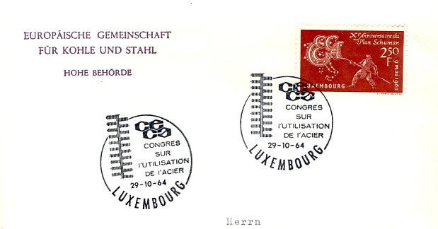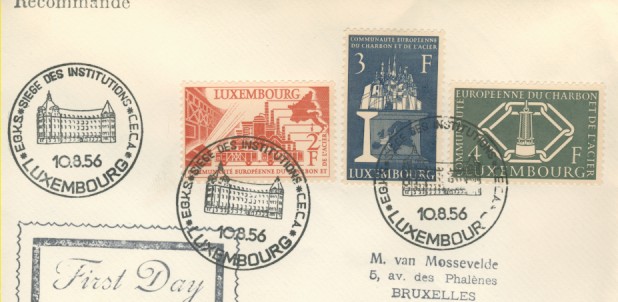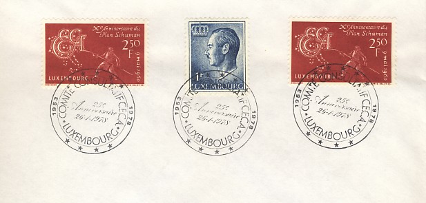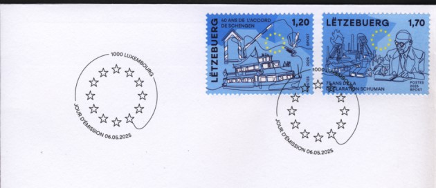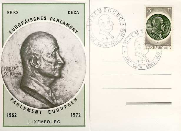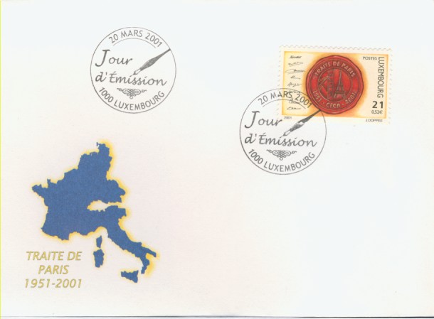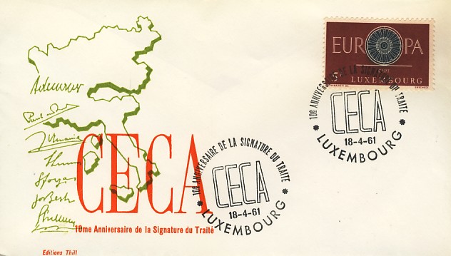 fondateur de la Communauté Economique Européenne Déclaration Schuman du 9 mai 1950 : « la production franco-allemande de charbon et d'acier dans sa totalité soit placée sous une Haute Autorité, dans la structure d'une organisation qui s'ouvre à la participation des autres pays de l'Europe. » Création de la Communauté européenne du charbon et de l'acier (CECA) par le traité de Paris le 18 avril 1951 entre l'Allemagne de l'Ouest, la Belgique, la France, l'Italie, le Luxembourg et les Pays Bas qui entre en vigueur le 23 juillet 1952, le marché commun du charbon le 10 février 1953 et celui de l'acier le 1er mai 1953. Création de la Communauté européenne de l'énergie atomique (CEEA ou Euratom) par un traité signé à Rome le 25 mars 1957 entre l'Allemagne de l'Ouest, la Belgique, la France, l'Italie, le Luxembourg et les Pays Bas et entré en vigueur le 1er janvier 1958. Création de la Communauté Economique Européenne (CEE) par le Traité de Rome du 25 mars 1957 entre l'Allemagne de l'Ouest, la Belgique, la France, l'Italie, le Luxembourg et les Pays Bas et entré en vigueur le 1er janvier 1958. L'Assemblée Parlementaire qui deviendra le Parlement Européen est crée par le traité de Rome. Fusion de la CEE, de la CECA et de l'Euratom par le Traité de Bruxelles le 8 avril 1965 et entré en vigueur le 1er juillet 1967. La CEE est remplacée par Union Européenne le 1er novembre 1993. Adoption de l'Euro : 1er janvier 1999 1956 - Europa - construction européenne ![]() ![]() 1956 : CECA ![]() ![]() 1958 : CECA ![]() 1960 : Elections européennes ![]() 1960 : Parlement européen ![]() 1961 : CECA : 10ème anniversaire du traité de Paris ![]() 1964 : Parlement européen ![]() 1964 : CECA : Congrès sur l'utilisation de l'acier ![]() 1965 : CECA : 2ème congrès sur l'utilisation de l'acier ![]() 1966 : CECA : 3ème congrès sur l'utilisation de l'acier ![]() 1966 : Centre européen de Luxembourg ![]() ![]() ![]() 1966 : Parlement européen ![]() ![]() ![]() 1968 : commission ![]() 1968 : CECA : 4ème congrès sur l'acier ![]() 1972 : Schuman ![]() ![]() 1972 : Office des publications officielles ![]() 1972 : Cour de Justice européenne ![]() ![]() 1973 : inauguration des batiments de la Cour de Justice européenne ![]() 1973 : Commission ![]() 1974 : commission ![]() ![]() 1976 : Conseil Européen à Luxembourg (avril) ![]() 1976 : Parlement européenne : session ![]() ![]() 1977 : 20ème anniversaire du traité de Rome ![]() ![]() 1977 : Parlement européen ![]() 1977 : BEI ![]() ![]() 1978 : CECA ![]() 1978 : office des publications officielles ![]() 1979 : Elections européennes (voir ce chapitre) 1979 : Parlement européen ![]() 1980 : Conseil européen à Luxembourg (décembre) ![]() 1981 : Parlement européen ![]() ![]() 1982 : CECA : Traité de Paris ![]() ![]() 1983 : CECA haute autorité ![]() 1983 : instances européennes ![]() 1984 Elections européennes (voir ce chapitre) 1985 : Conseil européen à Luxembourg (décembre) 1986 : Parlement européen ![]() ![]() 1986 : office des publications officielles ![]() 1987 : 30ème anniversaire des Traités de rome ![]() 1987 : Parlement européen ![]() 1987 : commission ![]() 1987 : Cour de justice européenne ![]() ![]() 1988 : 30ème anniversaire du Parlement Européen ![]() 1988-89 : Parlement européen ![]() ![]() 1988 : BIRD ![]() ![]() 1989 : Elections européennes (voir ce chapitre) 1989 : commission ![]() 1990 : office des publications officielles ![]() 1990 : Parlement européen ![]() 1990 : BEI ![]() 1991 : Conseil Européen à Luxembourg (juin) ![]() 1991 : Parlement européen ![]() 1991 : Conseil économique et social ![]() 1992 : 1er janvier 1993 mise en place du marché unique (émission du dernier trimestre 1992) ![]() ![]() 1993 : Marché unique ![]() 1993 : Parlement européen ![]() 1994 : office des publications officielles ![]() ![]() 1994 : Elections européennes (voir ce chapitre) 1997 : 40ème anniversaire du Traité de Rome ![]() ![]() 1997 : Conseil européen à Luxembourg (décembre) 1997 : Parlement européen ![]() 1997 : Cour de justice ![]() ![]() ![]() 1998 : Parlement européen ![]() 1998 : journée de l'Europe (Bientôt l'€) ![]() 1999 : arrivée de l'euro ![]() ![]() 2000 : 40ème anniversaire de la déclation Schuman ![]() 2001 : CECA ![]() ![]() 2002 : mise en service des pièces et billets en euro ![]() ![]() 2002 : Cour de justice et cour des comptes ![]() ![]() 2002 : Journeaux officiels ![]() ![]() 2002 : commission ![]() 2004 : Elections européennes (voir ce chapitre) 2005 : Présidence de l'Union Européenne ![]() 2006 : commission ![]() 2007 : 50ème anniversaire du traité de Rome ![]() ![]() 2008 : BCE ![]() ![]() 2008 : BEI ![]() ![]() 2008 : Cour de justice ![]() ![]() 2009 : 10ème anniversaire de l'Euro ![]() ![]() 2009 : Elections européennes (voir ce chapitre) 2010 : 25ème anniversaire des accords de Schengen ![]() 2012 : 10 ème anniversaire de l'introduction des pièces et billets en euro ![]() ![]() ![]() 2012 : Cour de justice européenne ![]() ![]() 2014 : Elections européennes (voir ce chapitre) 2015 : Présidence de l'Union Européenne ![]() ![]() 2015 : 30ème anniversaire des accords de Schengen ![]() 2019 : 50ème anniversaire de l'office des publications européennes ![]() 2019 : Elections européennes (voir ce chapitre) 2020 : 25ème anniversaire de l'ouverture de l'Espace Schengen ![]() ![]() 2022 : Cour de justice européenne ![]() ![]() 2024 : Elections européennes (voir ce chapitre) 2025 : 40 ans des accords de Schengen et 75 ans de la déclaration Schuman ![]() ![]() |